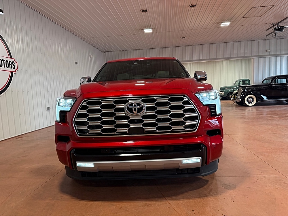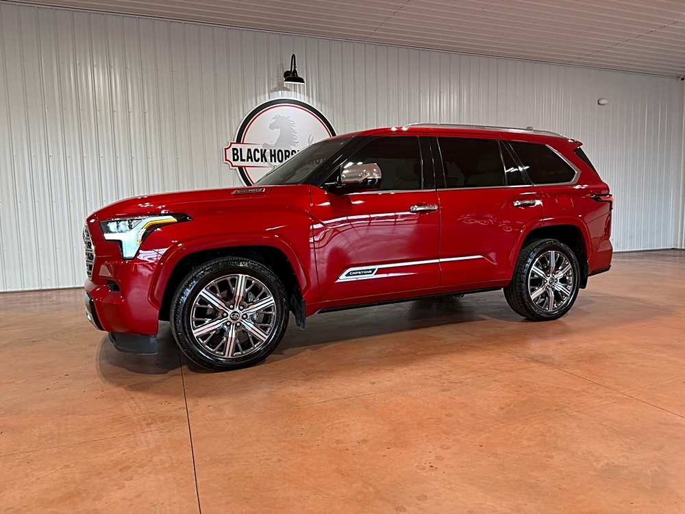 2023 Toyota Sequoia Capstone, finished in striking Supersonic Red over a black and white semi-aniline leather interior, representing the top…